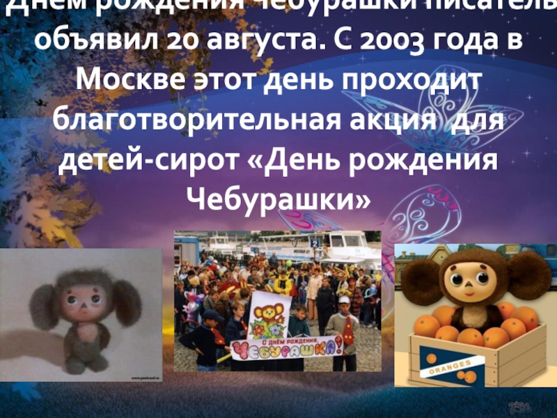 Днём рождения Чебурашки писатель объявил 20 августа. С 2003 года