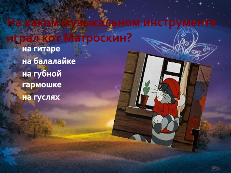 Слайд 23На каком музыкальном инструменте играл кот Матроскин?