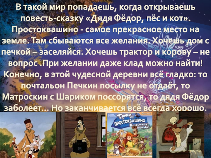сбываются все желания. Хочешь дом с печкой – заселяйся. Хочешь трактор и корову – не вопрос .При желании даже клад можно найти! Конечно, в этой чудесной деревни всё гладко: то почтальон Печкин посылку не отдаёт, то Матроскин с Шариком поссорятся, то дядя Фёдор заболеет… Но заканчивается всё всегда хорошо.