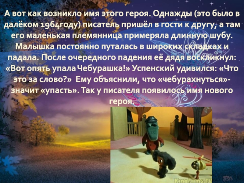 там его маленькая племянница примеряла длинную шубу. Малышка постоянно путалась в широких складках и падала. После очередного падения её дядя воскликнул: «Вот опять упала Чебурашка!» Успенский удивился: «Что это за слово?» Ему объяснили, что «чебурахнуться»-значит «упасть». Так у писателя появилось имя нового героя.