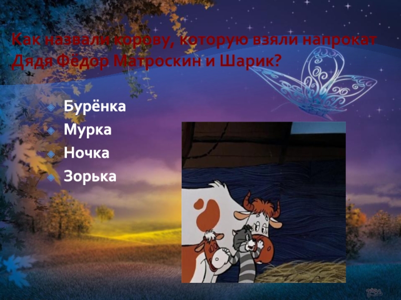 Слайд 25Как назвали корову, которую взяли напрокат Дядя Фёдор Матроскин и