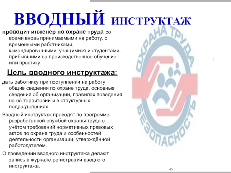 Лицо, поступающее на работу, получает направление на вводный инструктаж в отделе кадров. Инструктаж проводит инженер по
