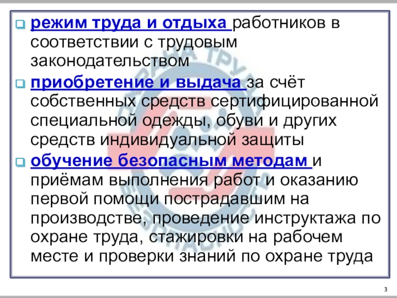 Слайд 3режим труда и отдыха работников в соответствии с трудовым законодательством