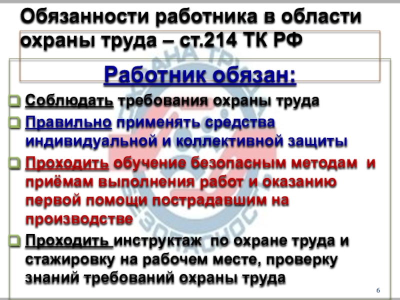 Обязанности работника в области охраны труда – ст.214 ТК РФ