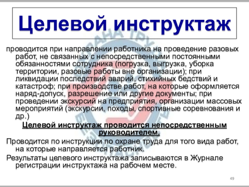 Целевой инструктаж по пожарной безопасности проводится непосредственно руководителем работ.