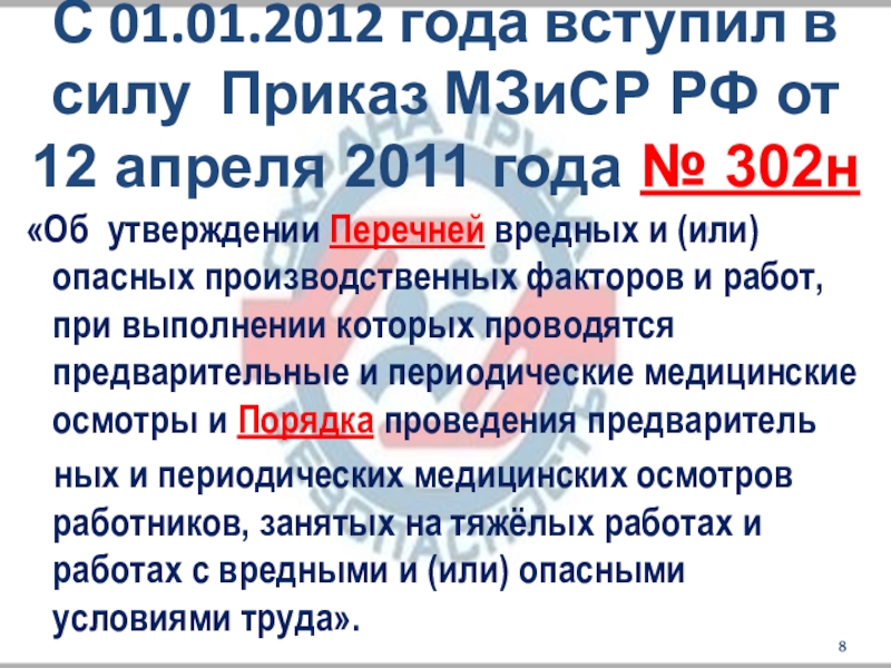 Слайд 8С 01.01.2012 года вступил в силу Приказ МЗиСР РФ от
