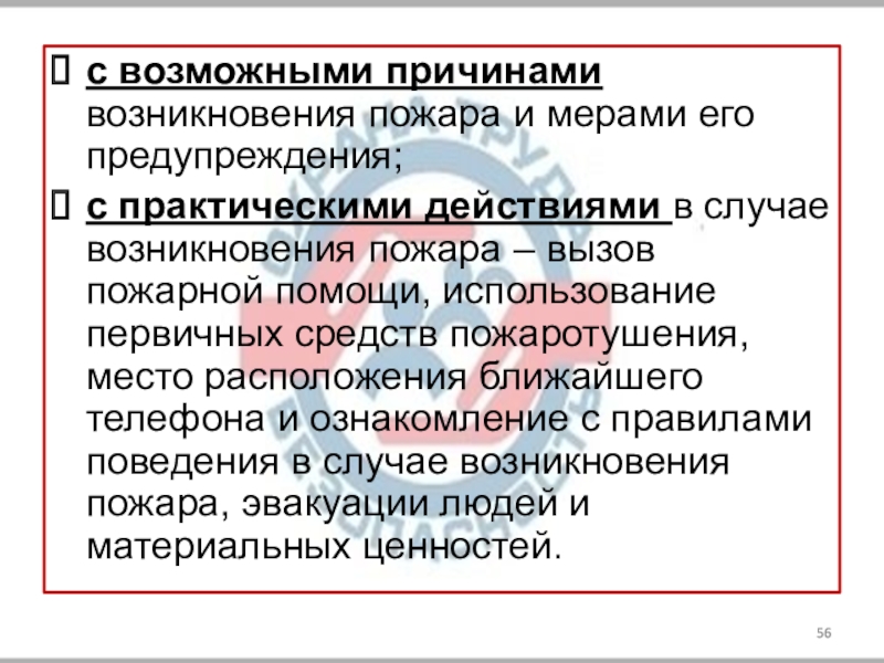 Слайд 56с возможными причинами возникновения пожара и мерами его предупреждения;