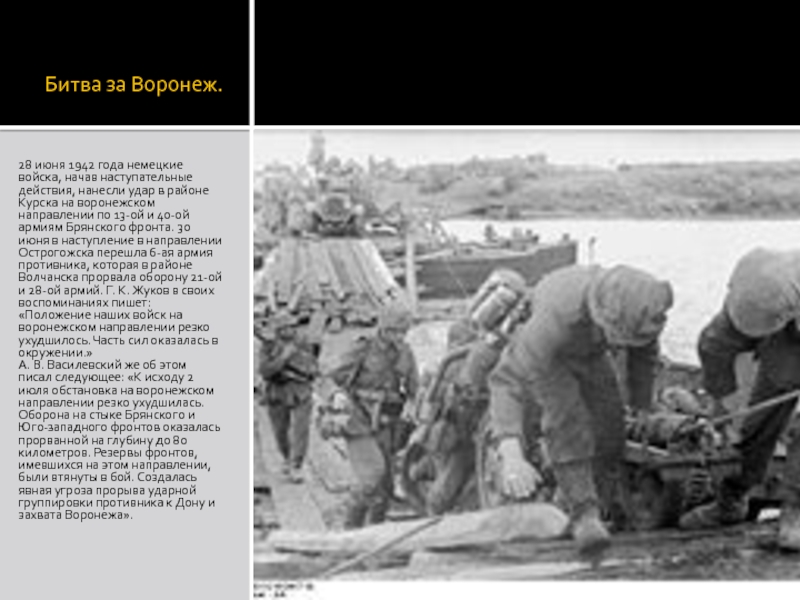 13-ой и 40-ой армиям Брянского фронта. 30 июня в наступление в направлении Острогожска перешла 6-ая армия противника, которая в районе Волчанска прорвала оборону 21-ой и 28-ой армий. Г. К. Жуков в своих воспоминаниях пишет: «Положение наших войск на воронежском направлении резко ухудшилось. Часть сил оказалась в окружении.»
