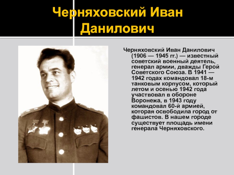 В 1941 — 1942 годах командовал 18-м танковым корпусом, который летом и осенью 1942 года участвовал в обороне Воронежа, в 1943 году командовал 60-й армией, которая освободила город от фашистов. В нашем городе существует площадь имени генерала Черняховского.
