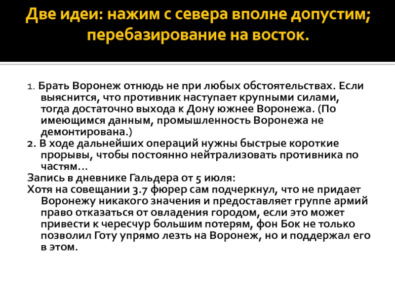 Слайд 6Две идеи: нажим с севера вполне допустим; перебазирование на восток.