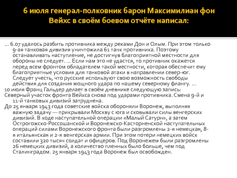 Слайд 76 июля генерал-полковник барон Максимилиан фон Вейхс в своём боевом
