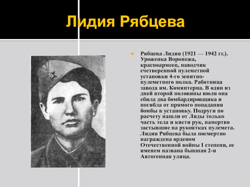 Коминтерна. В один из дней второй половины июля она сбила два бомбардировщика и погибла от прямого попадания бомбы в установку. Подруги по расчету нашли от Лиды только часть тела и кисти рук, намертво застывшие на рукоятках пулемета. Лидия Рябцева была посмертно награждена орденом Отечественной войны I степени, ее именем названа бывшая 2-я Автогенная улица.