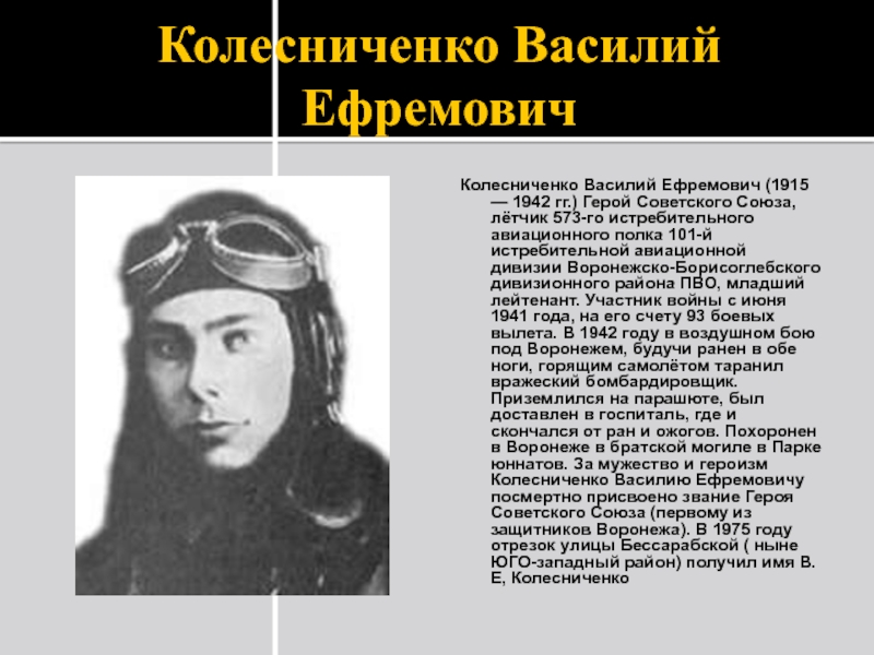 дивизии Воронежско-Борисоглебского дивизионного района ПВО, младший лейтенант. Участник войны с июня 1941 года, на его счету 93 боевых вылета. В 1942 году в воздушном бою под Воронежем, будучи ранен в обе ноги, горящим самолётом таранил вражеский бомбардировщик. Приземлился на парашюте, был доставлен в госпиталь, где и скончался от ран и ожогов. Похоронен в Воронеже в братской могиле в Парке юннатов. За мужество и героизм Колесниченко Василию Ефремовичу посмертно присвоено звание Героя Советского Союза (первому из защитников Воронежа). В 1975 году отрезок улицы Бессарабской ( ныне ЮГО-западный район) получил имя В. Е, Колесниченко