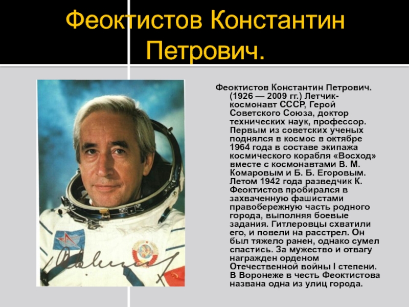 советских ученых поднялся в космос в октябре 1964 года в составе экипажа космического корабля «Восход» вместе с космонавтами В. М. Комаровым и Б. Б. Егоровым. Летом 1942 года разведчик К. Феоктистов пробирался в захваченную фашистами правобережную часть родного города, выполняя боевые задания. Гитлеровцы схватили его, и повели на расстрел. Он был тяжело ранен, однако сумел спастись. За мужество и отвагу награжден орденом Отечественной войны I степени. В Воронеже в честь Феоктистова названа одна из улиц города.