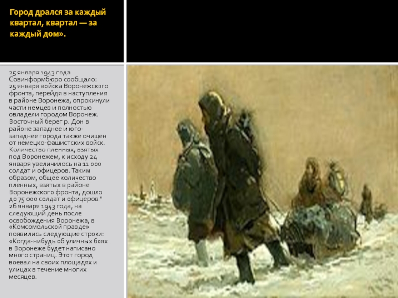 в наступления в районе Воронежа, опрокинули части немцев и полностью овладели городом Воронеж. Восточный берег р. Дон в районе западнее и юго-западнее города также очищен от немецко-фашистских войск. Количество пленных, взятых под Воронежем, к исходу 24 января увеличилось на 11 000 солдат и офицеров. Таким образом, общее количество пленных, взятых в районе Воронежского фронта, дошло до 75 000 солдат и офицеров."