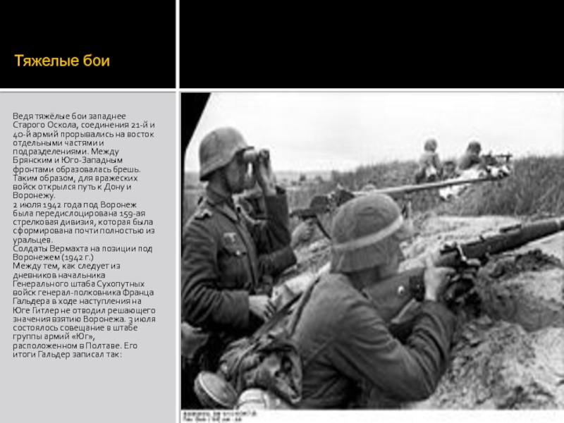 Между тем, как следует из дневников начальника Генерального штаба Сухопутных войск генерал-полковника Франца Гальдера в ходе наступления на Юге Гитлер не отводил решающего значения взятию Воронежа. 3 июля состоялось совещание в штабе группы армий «Юг», расположенном в Полтаве. Его итоги Гальдер записал так: