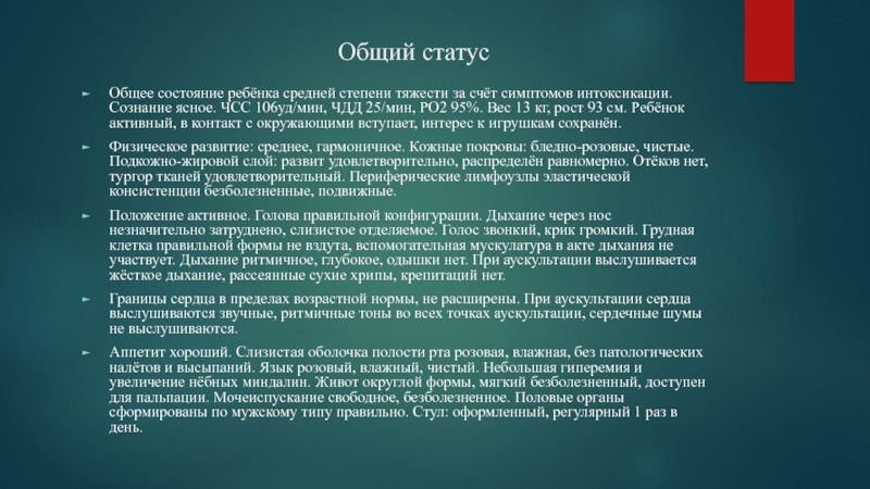 Общее состояние ребёнка средней степени тяжести за счёт симптомов интоксикации. Сознание ясное. ЧСС 106уд/мин, ЧДД 25/мин, PO2 95%. Вес 13 кг, рост 93 см. Ребёнок активный, в контакт с окружающими вступает, интерес к игрушкам сохранён.