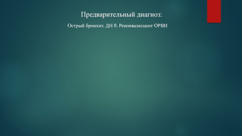На основании жалоб больного(малопродуктивный кашель, насморк, слизистое отделяемое из носа, повышение температуры тела, слабость, вялость),общего осмотра(при аускультации выслушивается жёсткое дыхание, рассеянные сухие хрипы, крепитаций нет), данных лабораторно-инструментальных исследований(Общий анализ крови: Соэ - 15 мм/ч, нейтрофилез; Общий анализ мочи: без патологий, ЭКГ: синусовая тахикардия, ЭОС нормальная,Рентгенография органов грудной клетки: очагово-инфильтративных теней не выявлено, лёгочный рисунок деформирован в прикорневых зонах) можно поставить диагноз: Острый бронхит. ДН 0. Реконвалесцент ОРВИ.