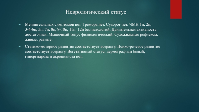 Статико-моторное развитие соответствует возрасту. Психо-речевое развитие соответствует возрасту. Вегетативный статус: дермографизм белый, гипергидроза и акроцианоза нет.