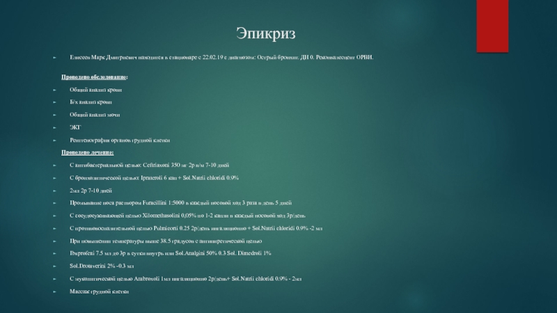 Елисеев Марк Дмитриевич находится в стационаре с 22.02.19 с диагнозом: Острый бронхит. ДН 0. Реконвалесцент ОРВИ.