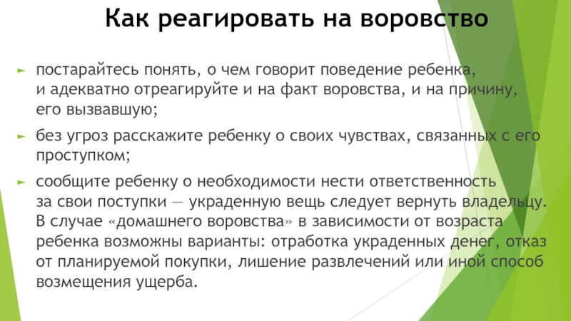 сообщите ребенку о необходимости нести ответственность за свои поступки — украденную вещь следует вернуть владельцу. В случае «домашнего воровства» в зависимости от возраста ребенка возможны варианты: отработка украденных денег, отказ от планируемой покупки, лишение развлечений или иной способ возмещения ущерба.