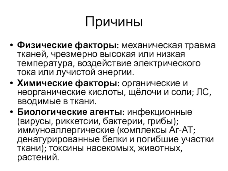 Причины: инфекционные агенты, термические и химические факторы
