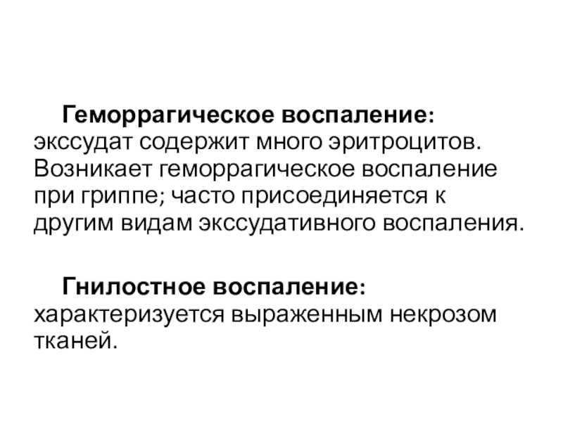 Слайд 24 Геморрагическое воспаление: экссудат содержит много эритроцитов. Возникает геморрагическое воспаление при