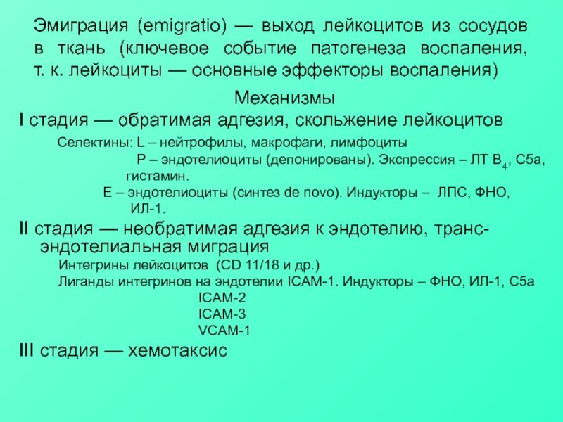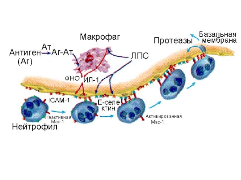 Лиганды интегринов на эндотелии ICAM-1. Индукторы – ФНО, ИЛ-1, С5а