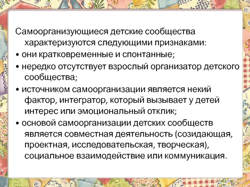• основой самоорганизации детских сообществ является совместная деятельность (созидающая, проектная, исследовательская, творческая), социальное взаимодействие или коммуникация.