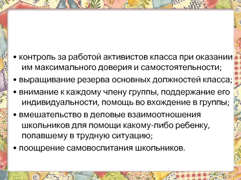 Слайд 49• контроль за работой активистов класса при оказании им максимального