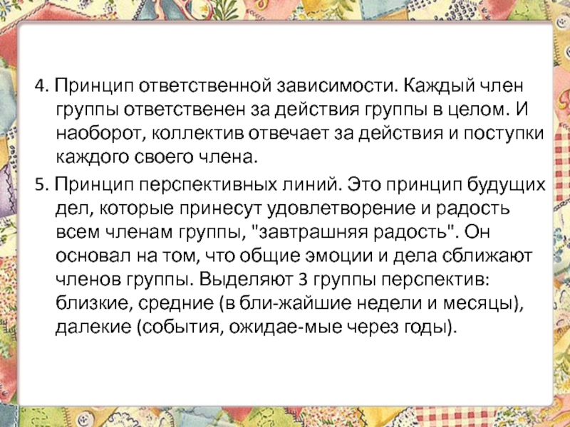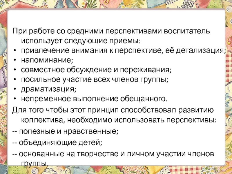 Для того чтобы этот принцип способствовал развитию коллектива, необходимо использовать перспективы: