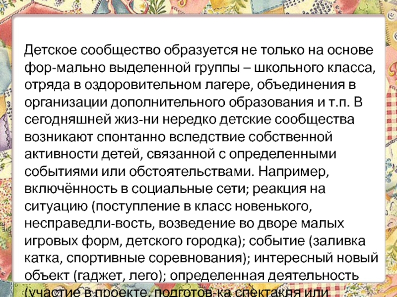 дополнительного образования и т.п. В сегодняшней жиз-ни нередко детские сообщества возникают спонтанно вследствие собственной активности детей, связанной с определенными событиями или обстоятельствами. Например, включённость в социальные сети; реакция на ситуацию (поступление в класс новенького, несправедли-вость, возведение во дворе малых игровых форм, детского городка); событие (заливка катка, спортивные соревнования); интересный новый объект (гаджет, лего); определенная деятельность (участие в проекте, подготов-ка спектакля или праздника, экскурсия или поездка) и др.