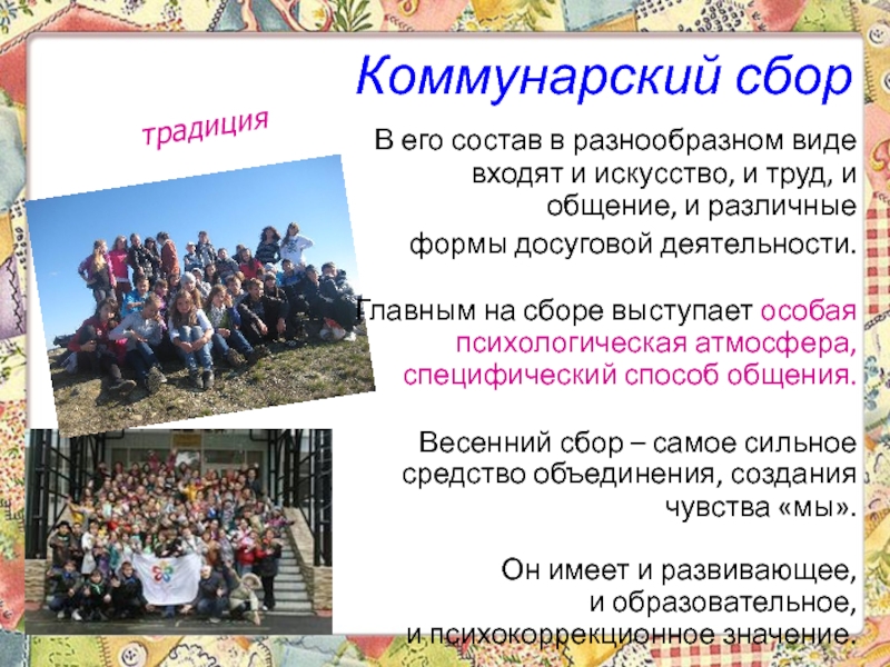 7. Принцип традиций в коллективе. Традиция – это те повторяющиеся элементы в жизни группы, которые отличают её от других групп. Традиции сплачивают детскую группу на основе совместных переживаний и действий, создают ощущение сопричастности и защищённости её членам, выражают общественное мнение. Выделяют несколько типов традиций: общешкольные; правила и порядки в классе; повседневные ритуалы группы.