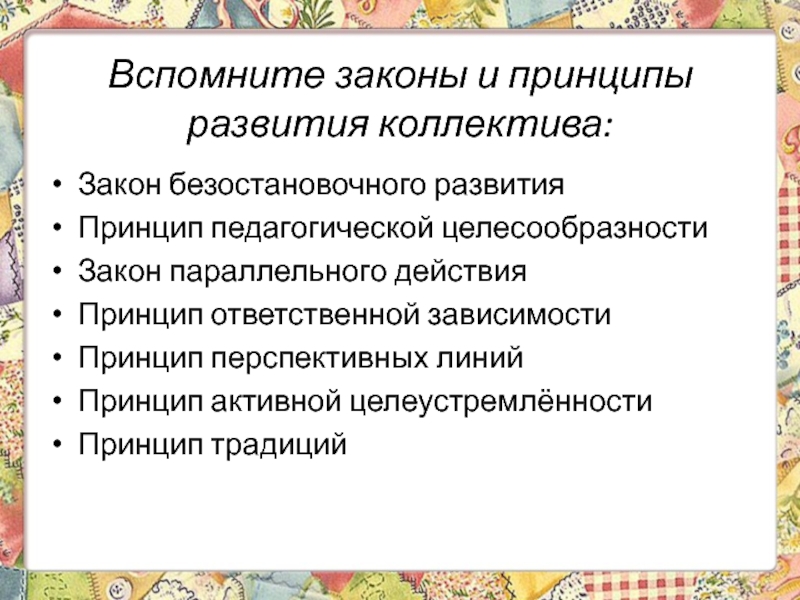 Слайд 41Вспомните законы и принципы развития коллектива:
