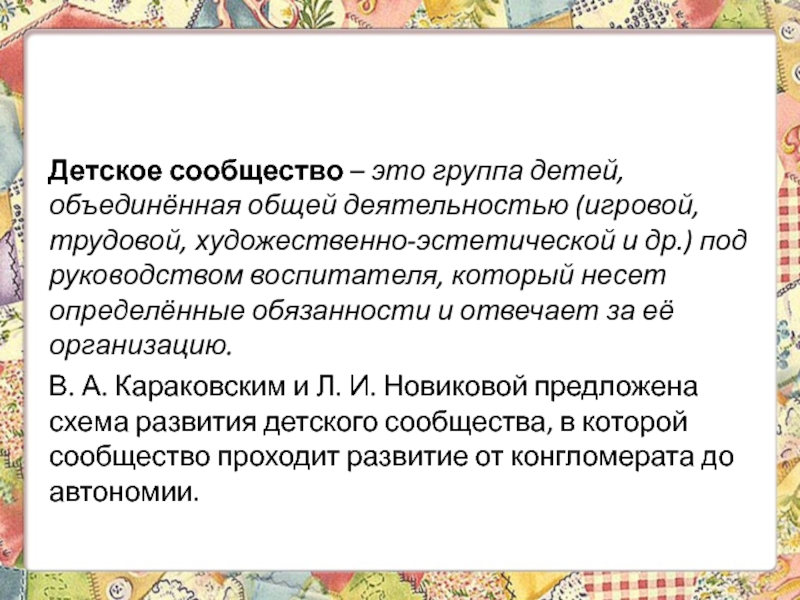 Слайд 52Детское сообщество – это группа детей, объединённая общей деятельностью (игровой,