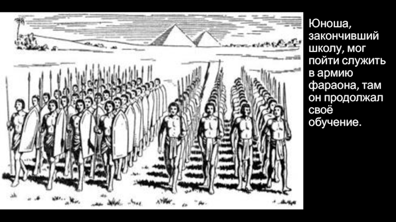Слайд 17Юноша, закончивший школу, мог пойти служить в армию фараона, там