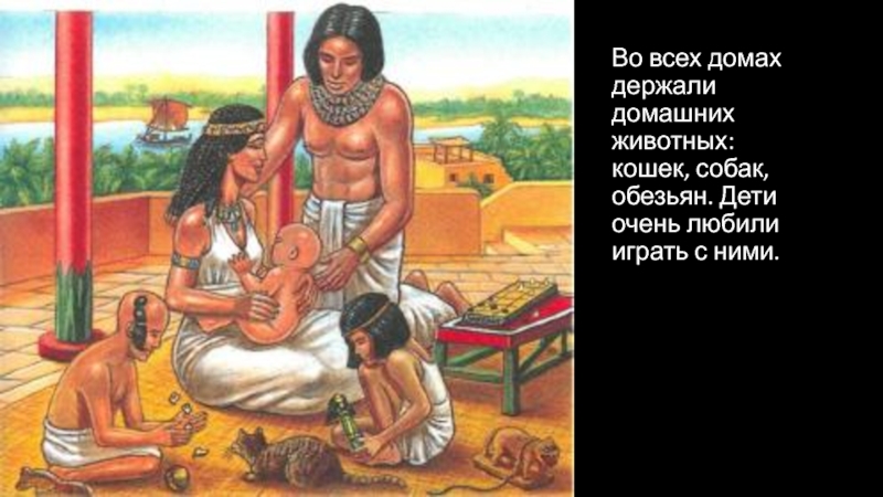 Слайд 6Во всех домах держали домашних животных: кошек, собак, обезьян. Дети