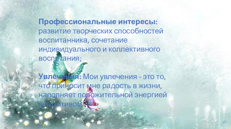 Профессиональные интересы: развитие творческих способностей воспитанника, сочетание индивидуального и