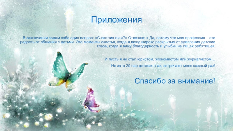Мне нравится смотреть на мир глазами детей, находить в этом радость и удовлетворение, думать о своих малышах, сопереживать их успехам и неудачам, нести за них ответственность.
