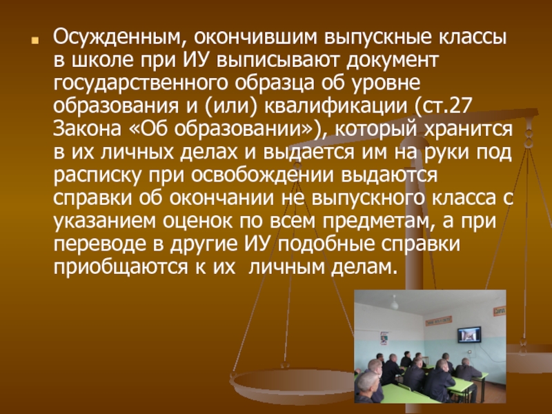 Слайд 22Осужденным, окончившим выпускные классы в школе при ИУ выписывают документ