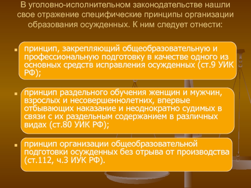 В уголовно-исполнительном законодательстве нашли свое отражение специфические принципы организации образования