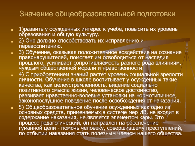 5) Общеобразовательное обучение осужденных как одно из основных средств, применяемых в системе мер ИВ, не входит в содержание наказания, не является элементом кары. Это процесс педагогический, он направлен на обеспечение гуманной цели - помочь человеку, совершившему преступлений, по отбытии наказания стать полезным членом нашего общества.