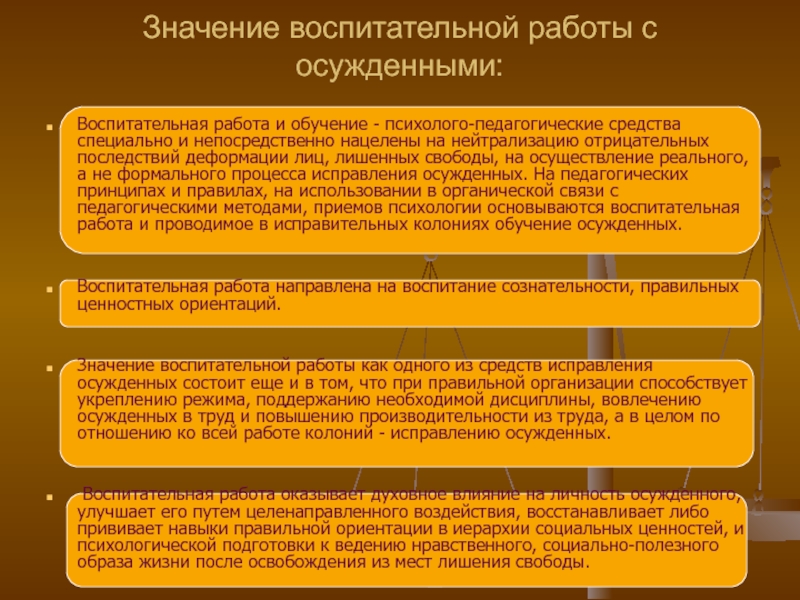 Воспитательная работа оказывает духовное влияние на личность осужденного, улучшает его путем целенаправленного воздействия, восстанавливает либо прививает навыки правильной ориентации в иерархии социальных ценностей, и психологической подготовки к ведению нравственного, социально-полезного образа жизни после освобождения из мест лишения свободы.