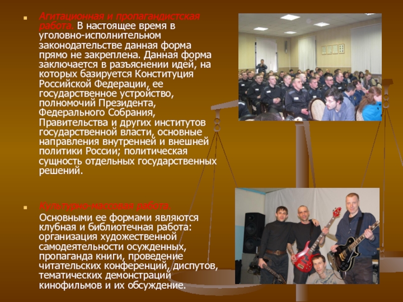 Слайд 13Агитационная и пропагандистская работа. В настоящее время в уголовно-исполнительном законодательстве