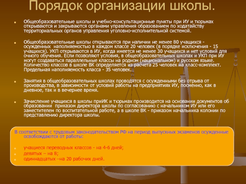 Организация учебно-воспитательного процесса в образовательных учреждениях уголовно-исполнительной системы регулируется прежде всего УИК РФ ст.112,