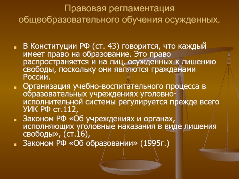 Слайд 20Правовая регламентация общеобразовательного обучения осужденных.