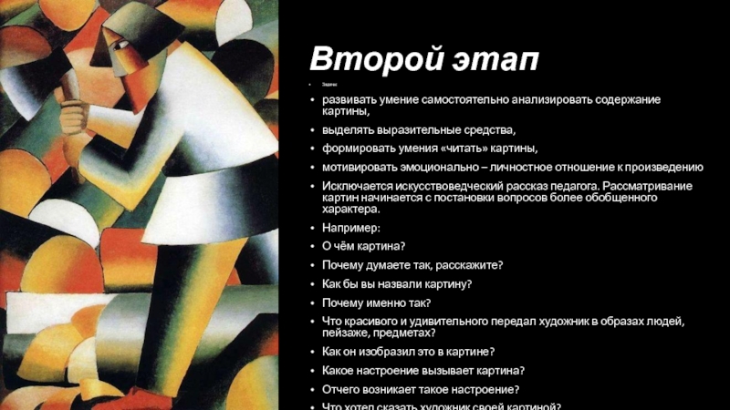 Основная задача взрослого — направить ребенка, активизировать его внимание, объяснить смысл произведения, скрытого за знаками, символами, вместе с ним выделить характерные особенности, выразительные средства. Самостоятельно дети не всегда способны справиться с такой задачей.