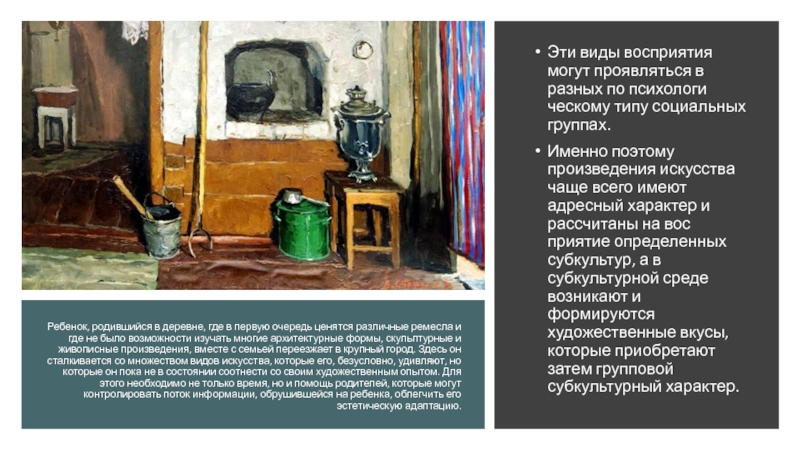 скульптурные и живописные произведения, вместе с семьей переезжает в крупный город. Здесь он сталкивается со множеством видов искусства, которые его, безусловно, удивляют, но которые он пока не в состоянии соотнести со своим художественным опытом. Для этого необходимо не только время, но и помощь родителей, которые могут контролировать поток информации, обрушившейся на ребенка, облегчить его эстетическую адаптацию.