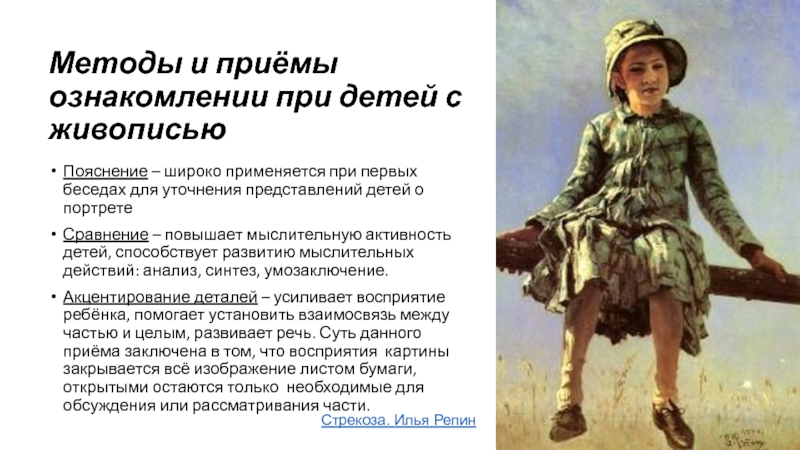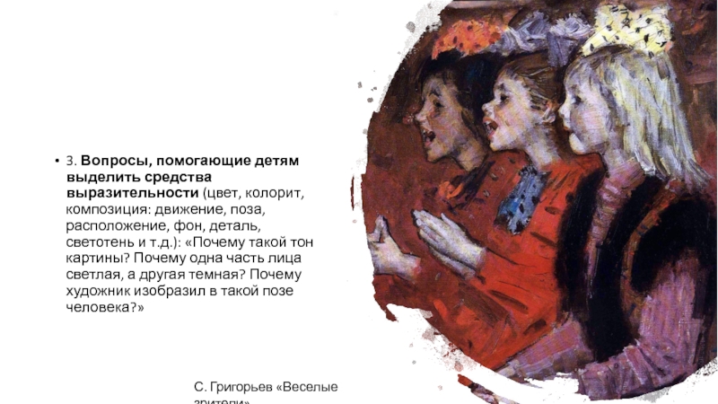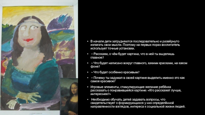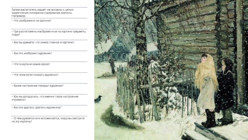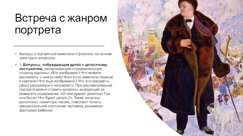 раскрывающие содержательную сторону картины: «Кто изображен? Что можете рассказать о нем (о ней)? Кого (что) заметили первым в картине? Что еще изображено? Что эти предметы (фон) рассказали о человеке?». При рассматривании портрета можно ставить вопросы, выходящие за рамки его содержания: «О чем думает девочка? Где она была? Что будет делать?». Такие вопросы дополняют сюжетную линию, помогают понять эмоциональное состояние человека, развивают фантазию ребенка