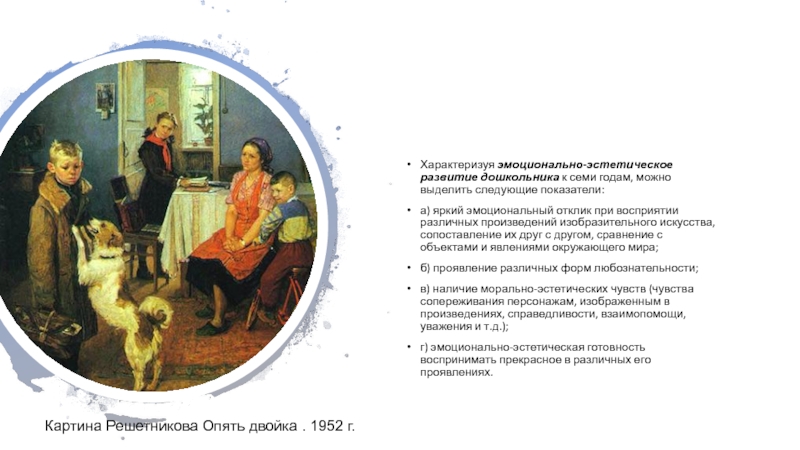 Слайд 8Характеризуя эмоционально-эстетическое развитие дошкольника к семи годам, можно выделить следующие показатели: